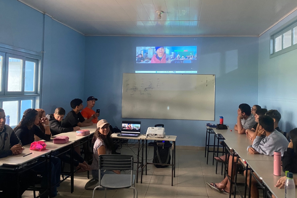 We couldn’t pass up the opportunity for students of the 9th grade from Izabel Cristina School to connect virtually for the first time with students from the 7th-8th grade of the Delores D Echum Composite School (DDECS) from Moose Factory, Ontario.