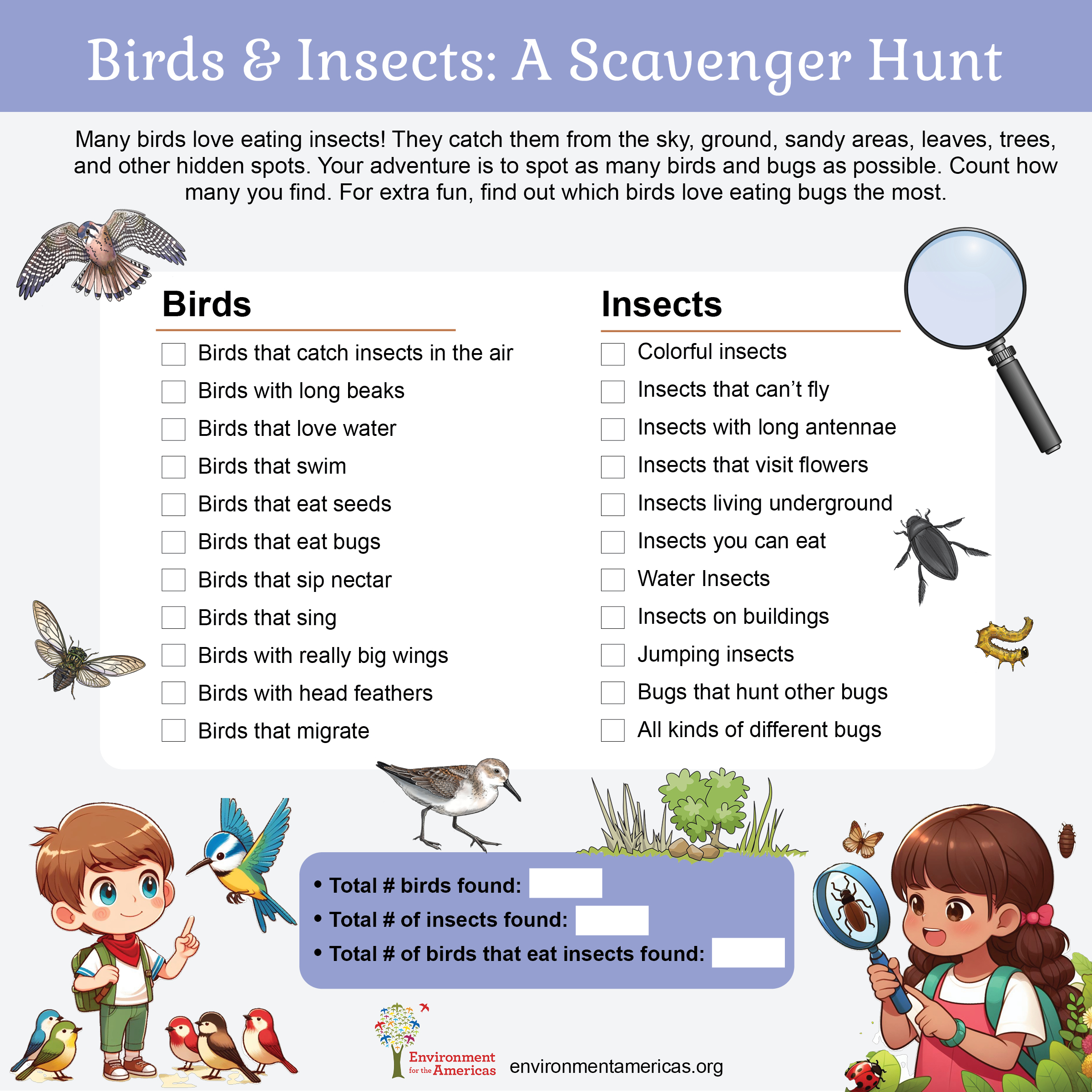 Get outside and explore your NatureHood. The first person to observe the items in a straight or diagonal line wins. As you explore – notice the sights, sounds, and smells. Challenge yourself to learn something new about nature all around you.