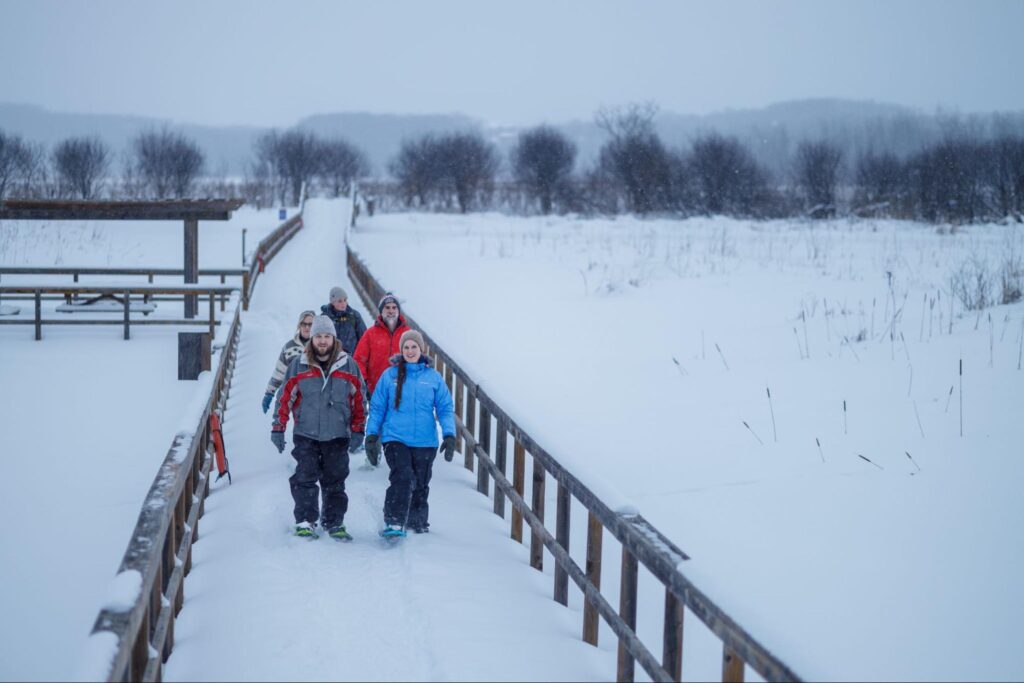 Winter arrives quietly, transforming more than 25 kilometres of trails into snow-covered pathways through wetlands and woodlands. Cross-country skis glide across groomed tracks and snowshoes press soft patterns into fresh powder. Animal footprints tell stories of unseen life and movement, while bare branches allow sightlines to stretch further across frozen water.