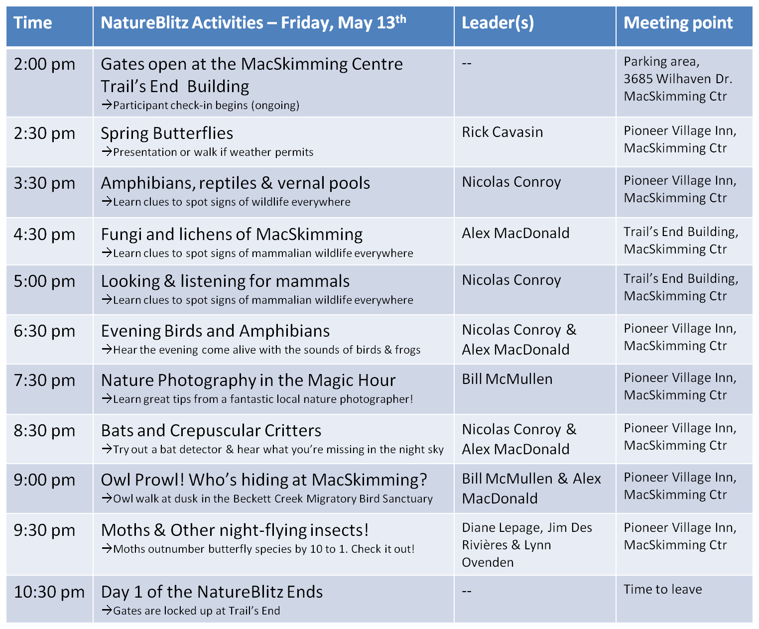 Day 1 Schedule for MacSkimming NatureBlitz - May 13, 2016