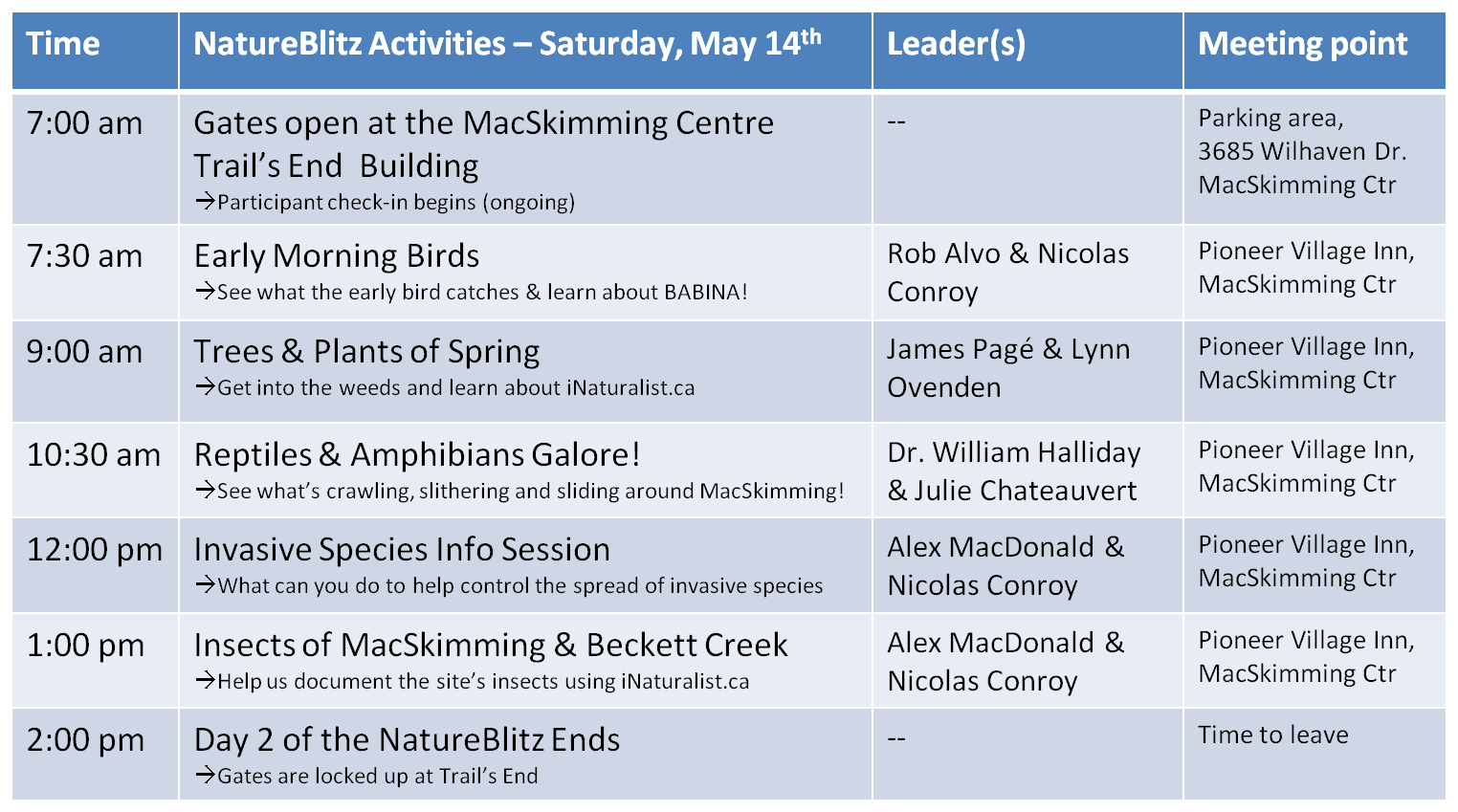 Day 2 Schedule for MacSkimming NatureBlitz - May 14, 2016