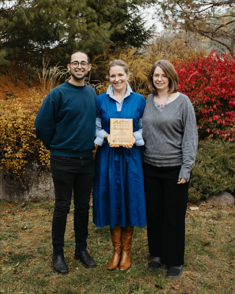 Rebecca Law from NatureKidsBC accepting the Partner in Conservation 2025 Award. From left to right: Jason Barron (Nature Canada’s NatureHood Organizer), Rebecca Law, and Nature Canada’s Executive Director Emily McMillan.